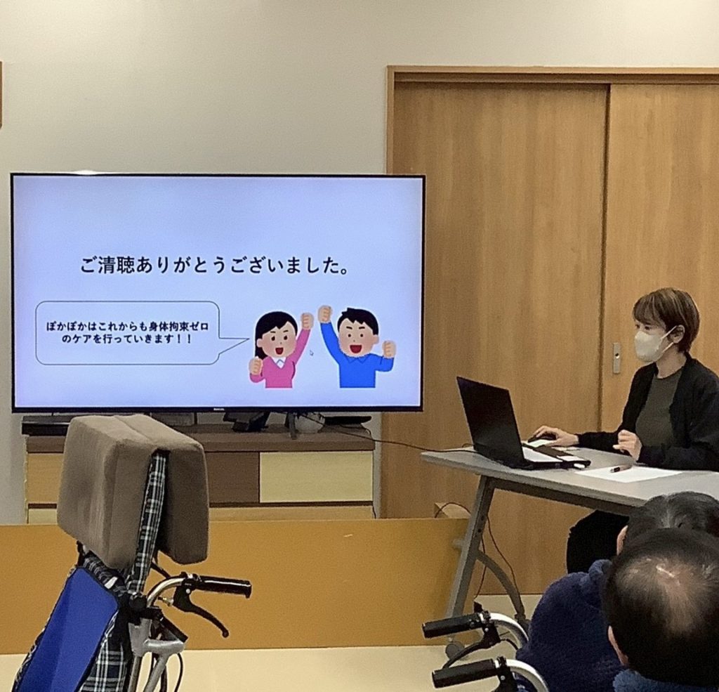 ぽかぽかでは身体拘束を必要としない方法や状況を職員全員で考え、身体拘束ゼロを続けていきます。